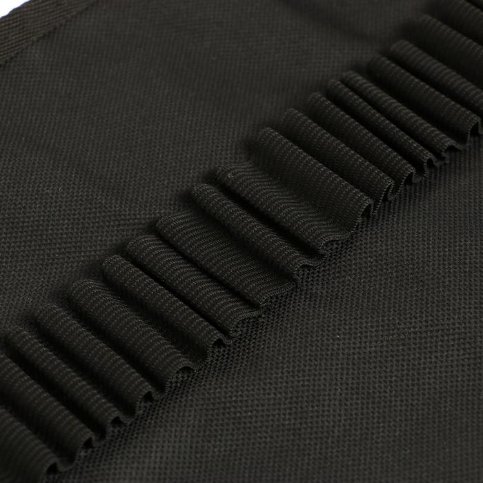 Текстильный футляр-роллер на 36 карандашей. Есть петля для ластика и небольшой карман для точилки. Пенал черного цвета. Петли для цветных карандашей и ластика, а также карман для точилки изготовлены из текстильной резины. После прокатки пенал закрывается кнопкой на текстильной резине.