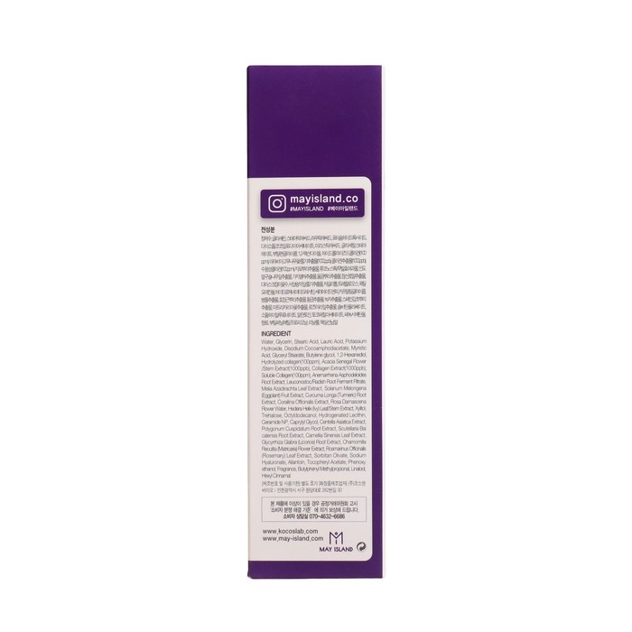 Purified water, glycerin, stearic acid, lauric acid, potassium hydroxide, disodium cocoamphodiacetate, myristic acid, glyceryl stearate, butylene glycol, 1,2-hexanediol, hydrolyzed Collagen (100ppm), Arabian rubber tree flower/stem extract (1,000ppb), collagen extract (1,000ppb), water-soluble collagen (100ppm), Jimo root extract, leukonostock/non-fermented filtrate, Indian mulberry leaf extract, Eggplant fruit extract, turmeric root extract, true coral horse extract, damask rose flower water, western pine leaf/stem extract, xylitol, trehalose, octyldodecanol, hydrogenated lecithin, ceramide NP, caprylyl glycol , Centella asiatica extract, Hojanggeun root extract, golden extract, green tea extract, Spanish licorice root extract, matricaria flower extract, rosemary leaf extract, sorbitanolibate, sodium hyaluronate, allantoin, tocopheryl acetate, phenoxyethanol, Fragrance, butylphenylmethylpropional, linalul, hexylcinnamal.