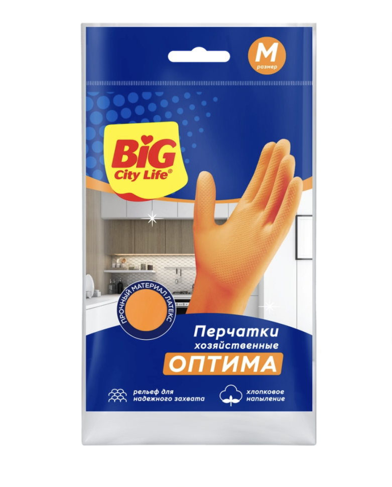 BIG CITY LIFE. Перчатки латексные Оптима оранжевые размер M от бренда BIG CITY LIFE подходят для любых видов работ дома и в саду. Перчатки защищают руки от воды и раздражения от агрессивных моющих средств. Внешняя рельефная сторона перчатки в области пальцев и ладошки обеспечивает уверенный захват и фиксацию скользких предметов. Перчатки легко одеваются и снимаются, не скатываются. Размер M подходит для женских рук, размерная сетка есть на обратной стороне упаковки.