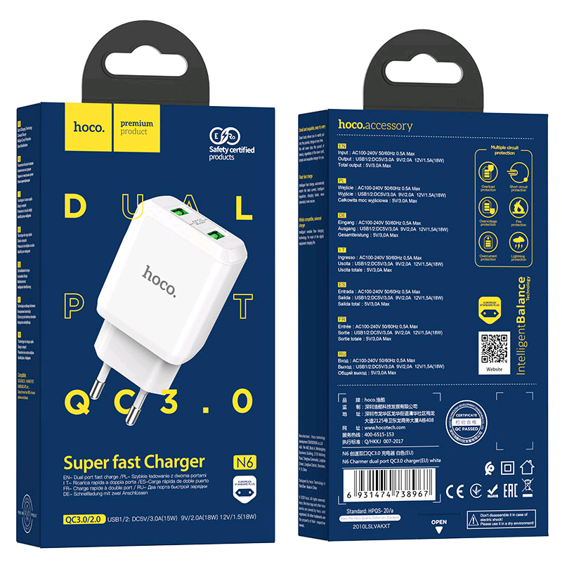Переходник N6 СЗУ на 2 USB 3A HOCO белый