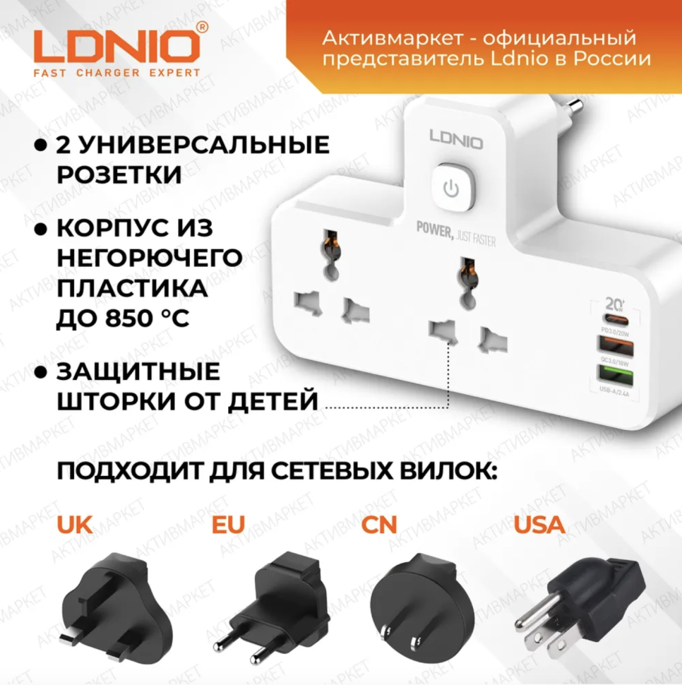Переходник на 2 розетки + 2 USB + Type-C 3.A 1 SC2311 LDNIO