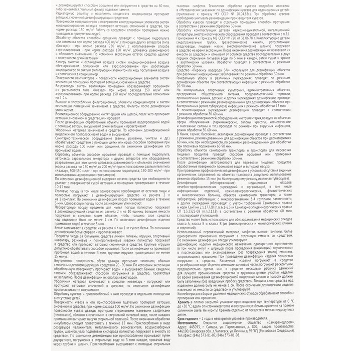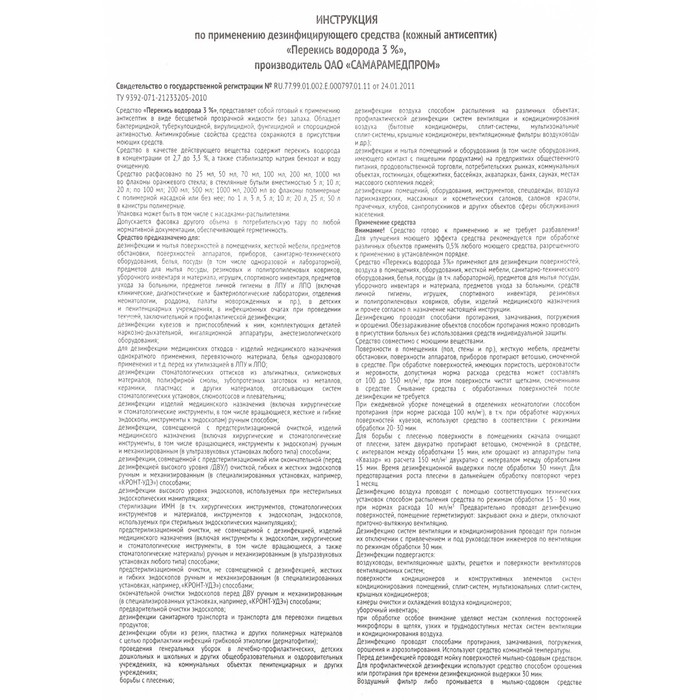 - Действующее вещество: перекись водорода 50% - от 5 г до 6,12 г в зависимости oт содержания водорода пероксида в исходной субстанции - эквивалентно содержанию водорода пероксида 3 г.