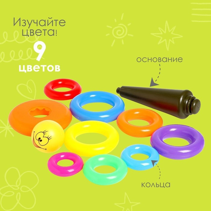 Пирамидка "Улыбка-4", 9 колец – это одна из самых первых игрушек, которая дает ребенку представление о размерах и цветах предметов. Малыш сравнивает между собой детали и учится логически мыслить. Пирамида состоит из 9-ти колец и игрушки-наконечника, завершающей собирательный процесс. Все предметы изготовлены из безопасного нетоксичного пластика.