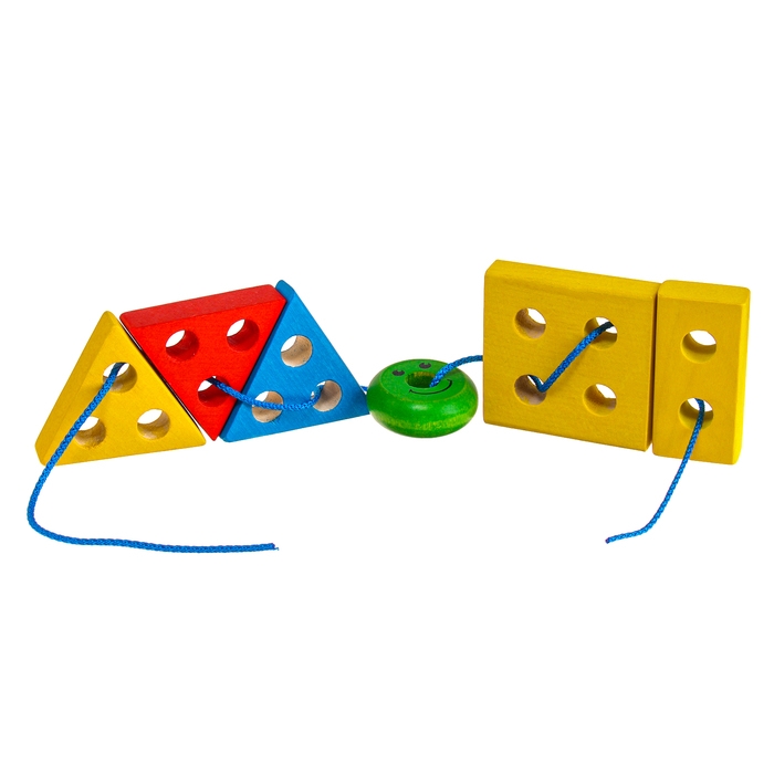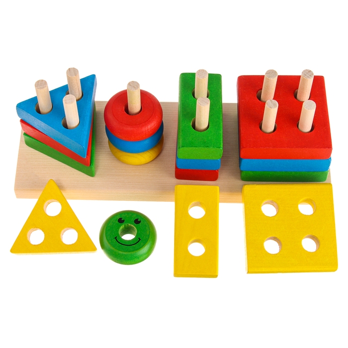 - Задача малыша — правильно подобрать деталь по количеству отверстий и надеть её на столбики.