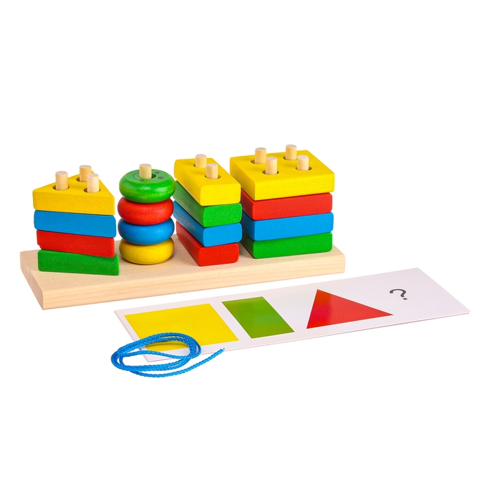 - Пирамидка представляет собой основание со штырьками и набор геометрических фигур.