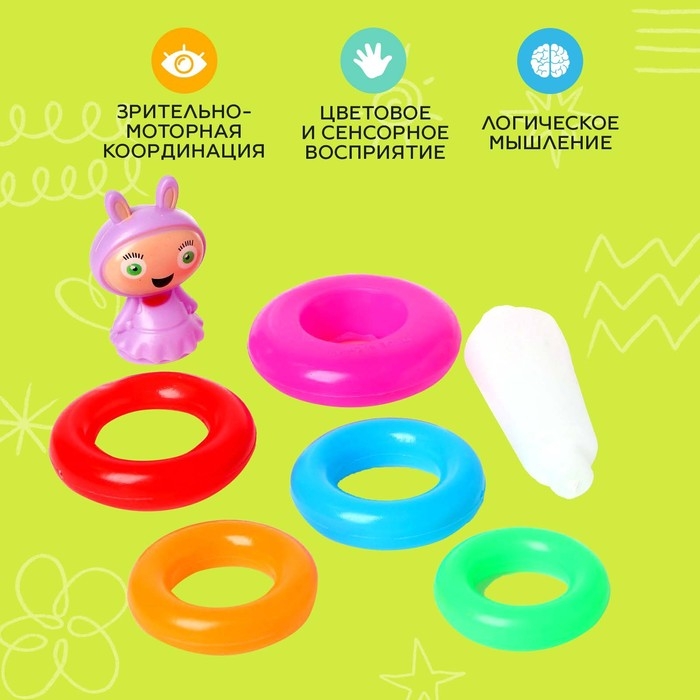 Пирамидка состоит из пяти колец, сверху устанавливается яркая игрушка с забавной мордочкой, завершающая конструкцию. Яркий и привлекательный дизайн игрушки от ТМ «Крошка Я» обязательно понравится карапузу.
