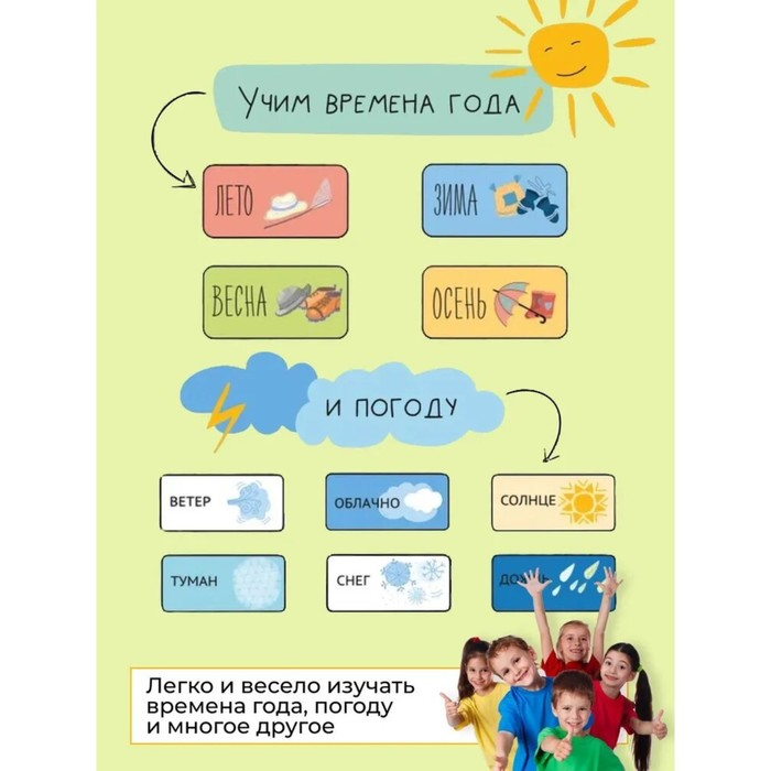 Иллюстрированный календарь поможет ребёнку в игровой форме изучить даты, дни недели, месяцы, времена года, погоду и многое другое.