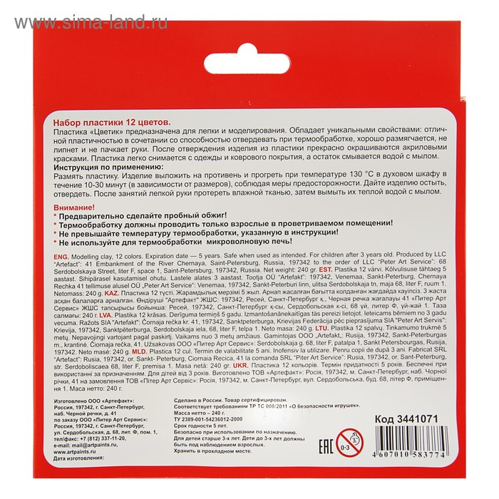 Пластика-полимерная глина запекаемая набор, ЗХК "Цветик", 12 цветов х 20 г (240 г)