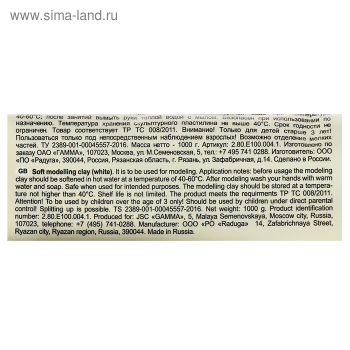Пластилин скульптурный белый, мягкий, 1000 г, "Гамма"