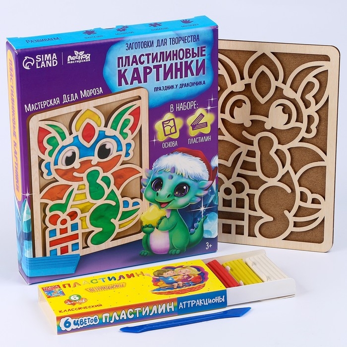 Возьмите деревянную основу для лепки и заполните её пластилином по образцу на упаковке или проявите фантазию. Дополнительно вы можете раскрасить деревянные линии.