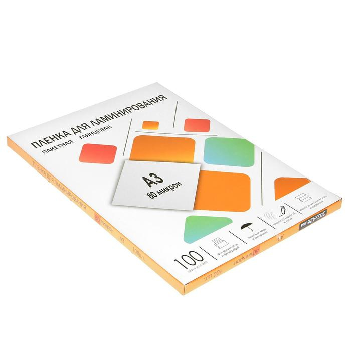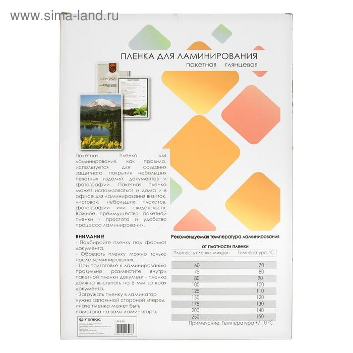 Пленка для ламинирования A3 303х426 мм, 80 мкм, 100 штук, глянцевые, Гелеос