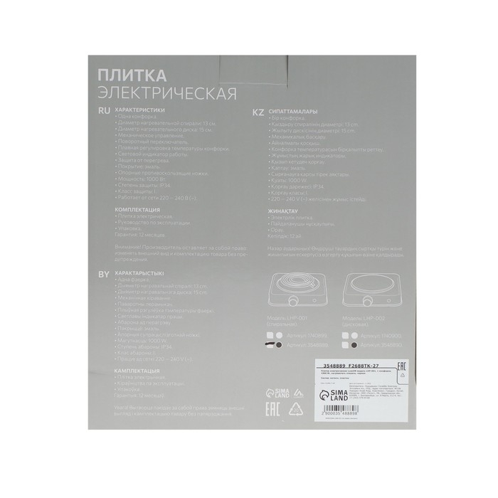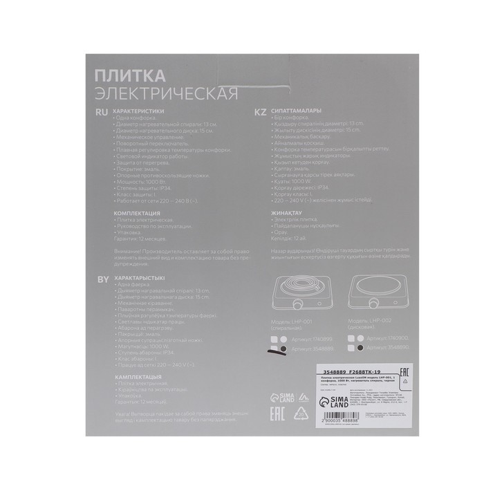 Плитка электрическая Luazon LHP-001, 1 конфорка, 1000 Вт, нагреватель спираль, черная
