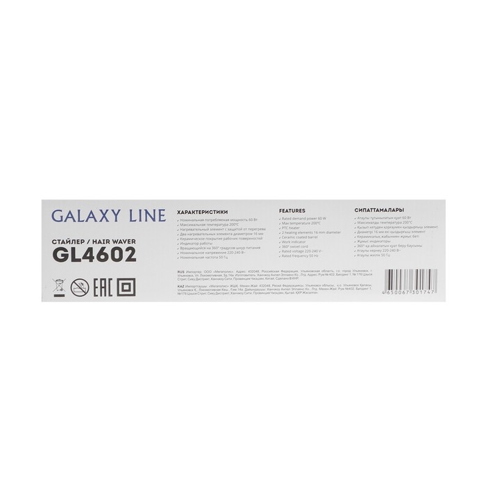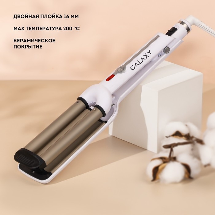 Плойка Galaxy GL 4602, 60 Вт, керамическое покрытие, d=16 мм, 200°С, белая