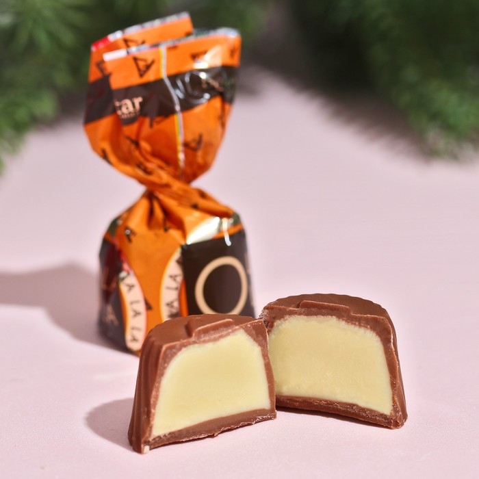 Состав: сахар, заменитель масла какао (масло пальмоядровое рафинированное, дезодорированное, фракционированное, гидрогенизированное), сыворотка молочная сухая, какао-порошок, эмульгаторы (лецитин Е322, Е476), начинка: сахар, жир специального назначения (масла растительные рафинированные, дезодорированные, модифицированные), сыворотка молочная сухая, мальтодекстрин, порошок манго сублимированный, ароматизатор натуральный «Манго», краситель пищевой – куркумин.