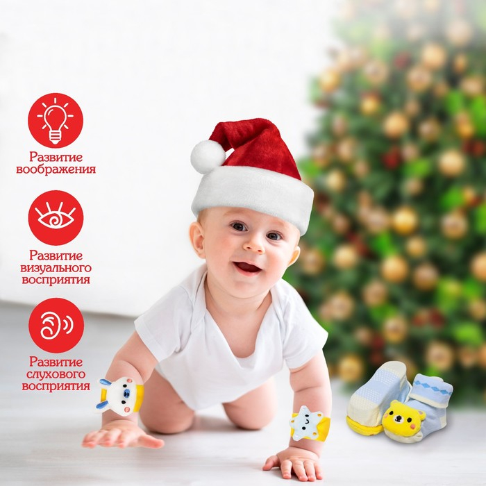Набор состоит из двух носочков и двух браслетиков с погремушками. Изготовлены из качественного и безопасного для здоровья детей материала, который не выцветает. Они подарят улыбку и мальчикам, и девочкам, а также станут отличным подарком вашим близким.