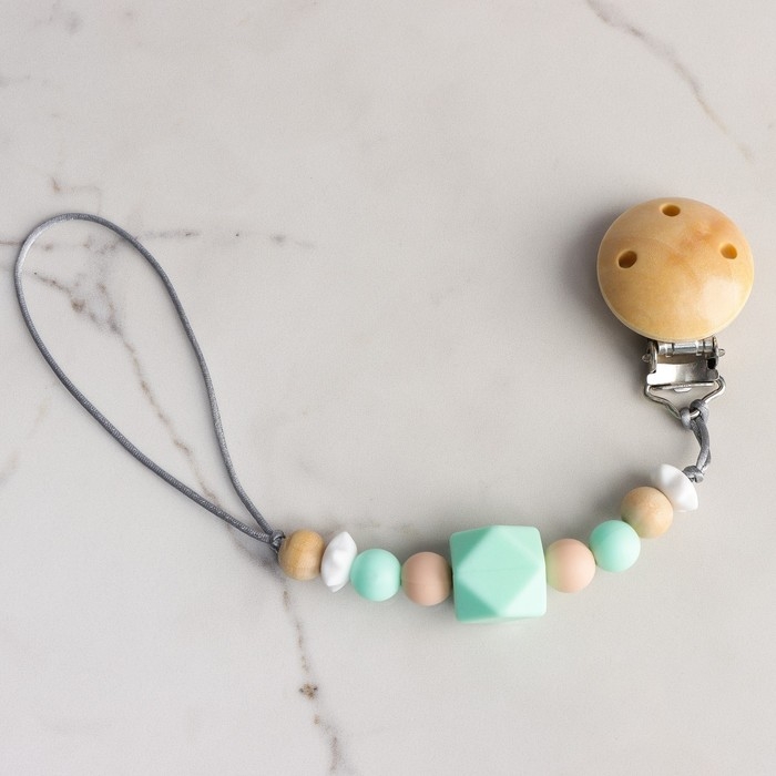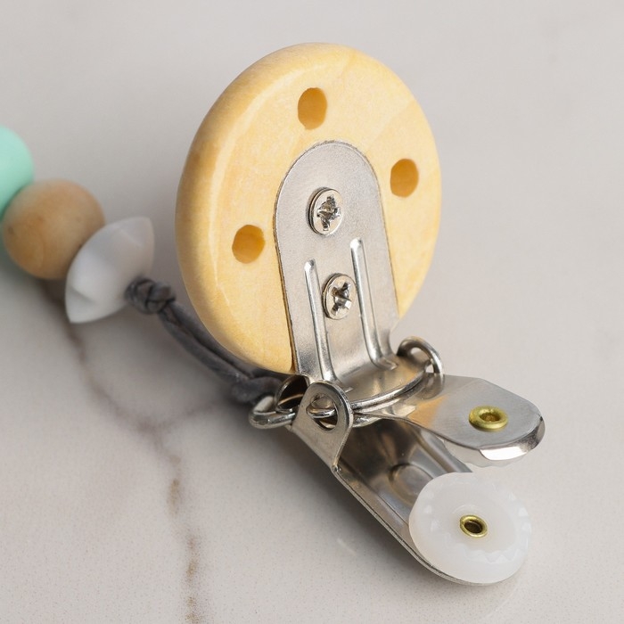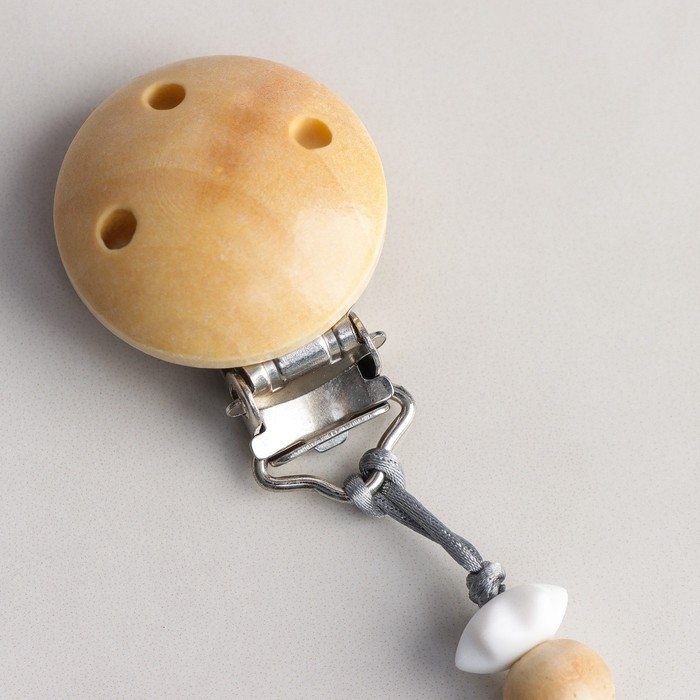 Изделие фиксируется на одежде ребёнка. На конце цепочки есть карабин, который зацепляется за кольцо пустышки. Надёжное крепление убережёт вещь от падения на пол, если малютка случайно выронит её изо рта.