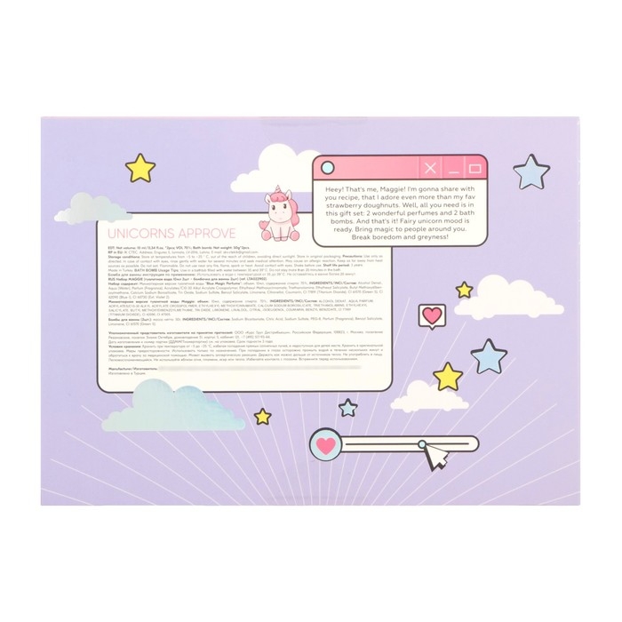 Что может быть приятнее, чем получить в подарок волшебные продукты UNICORNS APPROVE? Получить в подарок целый набор продуктов, которые одобрили единороги! Этот подарочный набор UNICORNS APPROVE включает 2 флакона туалетной воды и 2 бомбочки для ванной. Мэгги постаралась и сделала все в единой цветовой гамме, чтобы восторг от подарка был вдвое сильнее! Волшебное шипение и чудесный аромат не оставят вас равнодушным. Дарите магию единорогов!