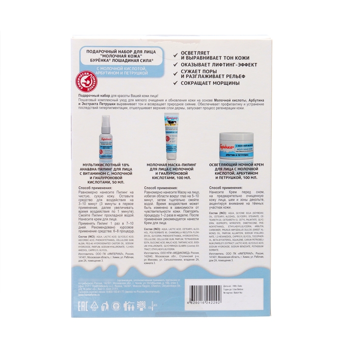 Основной ингредиент набора - молочная кислота, которая является природным эксфолиантом и помогает удалить омертвевшие клетки кожи, улучшить текстуру кожи и придать ей здоровый блеск.