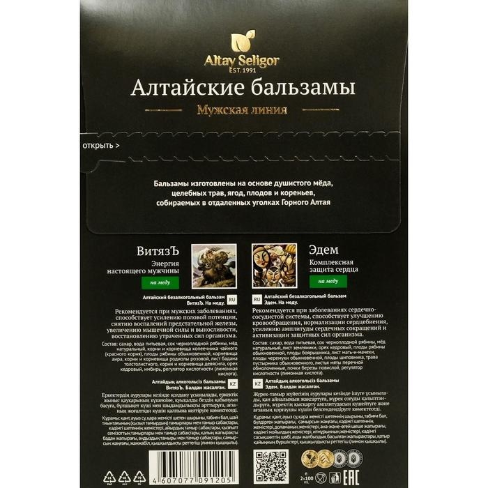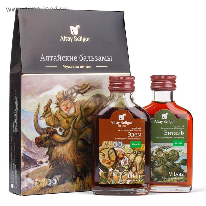 В подарочный набор входят безалкогольные бальзамы на меду «Эдем» и «Витязь». Объём флаконов: 100 мл.