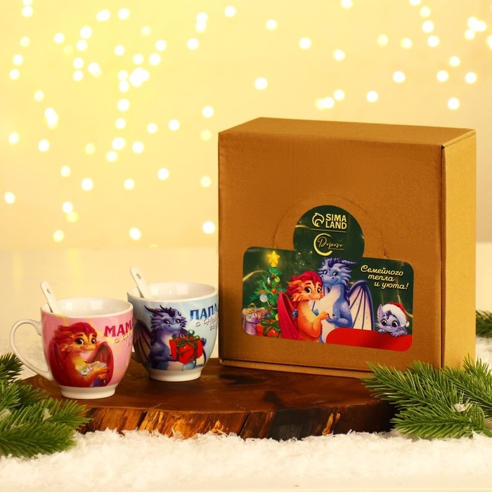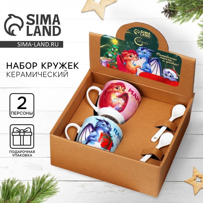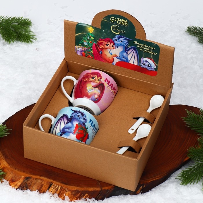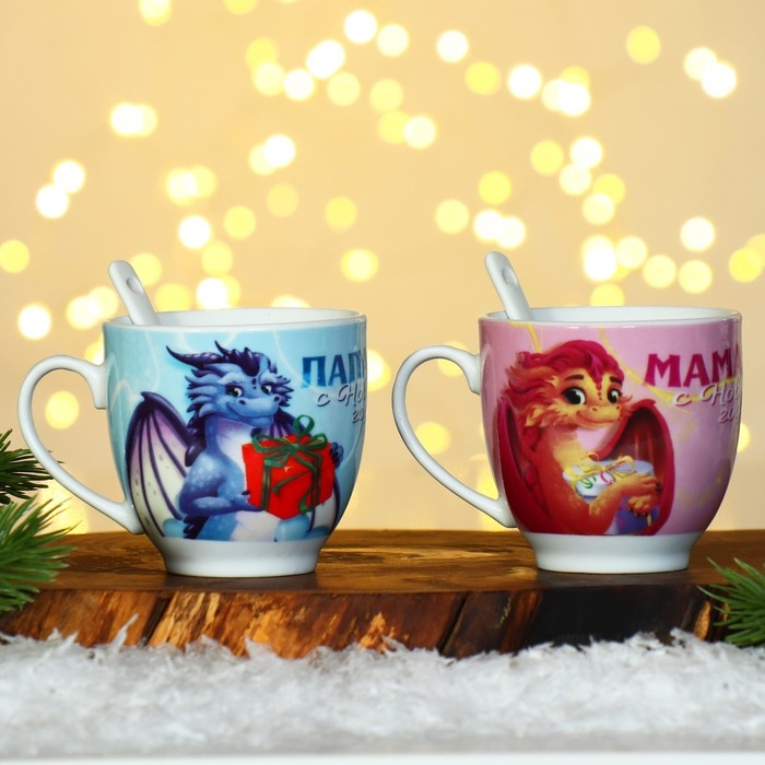 Подарочный набор новогодний из керамики «Мама, папа, с Новым годом!», кружка 180 мл. 2 шт., ложка 2 шт., цвет белый