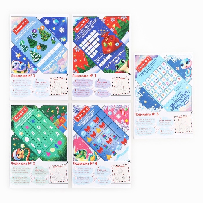 Этот набор включает в себя 5 писем от Деда Мороза, каждое из которых содержит загадку или задание, связанное с поиском подарка.