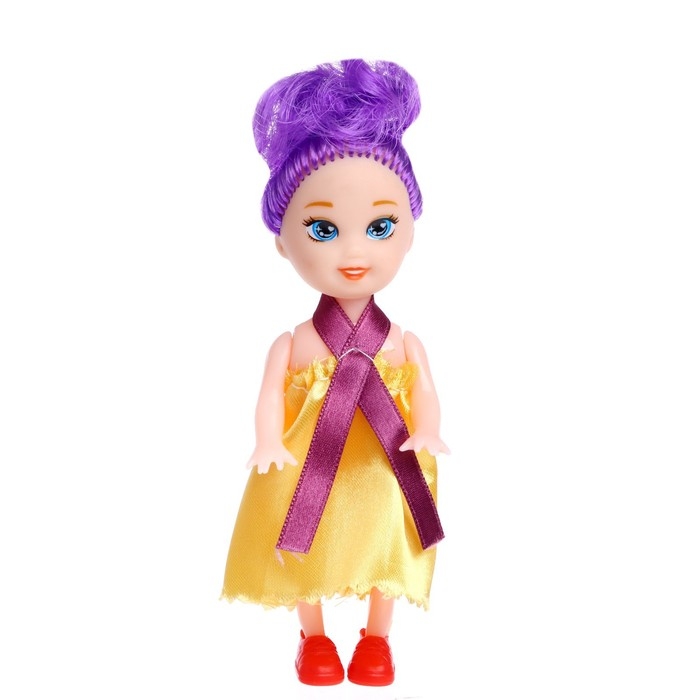А чтобы ребёнку веселей было пить чай, он может взять с собой куколку. Эта малышка не даст заскучать. У неё золотистые волосы и яркое цветное платьишко. Сделайте кукле красивую причёску или заплетите косички! Размер игрушки: 3,5 × 2 × 10 см.