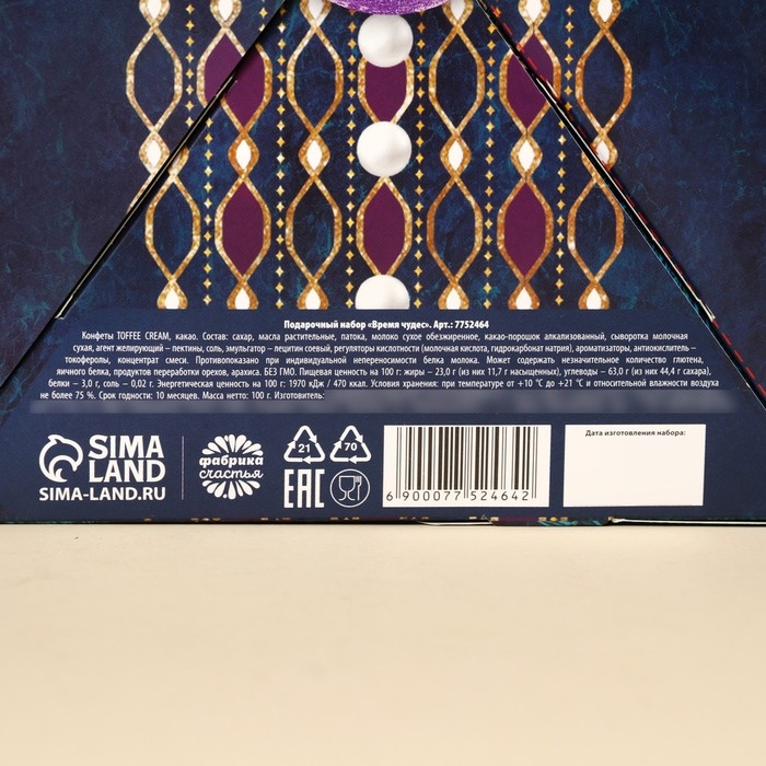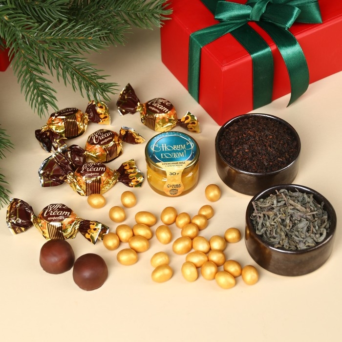 Подарочный набор «Время чудес»: чай чёрный со вкусом: ваниль и карамель 20 г., чай зелёный с жасмином 20 г., арахис шоколаде70 г., шоколадные конфеты 100 г., крем-мёд с апельсином 30 г.