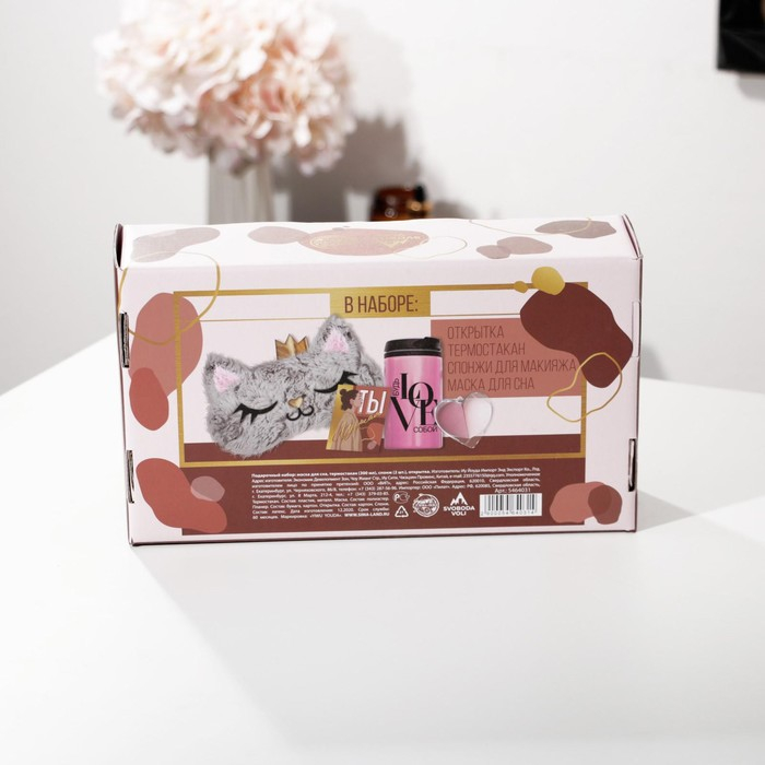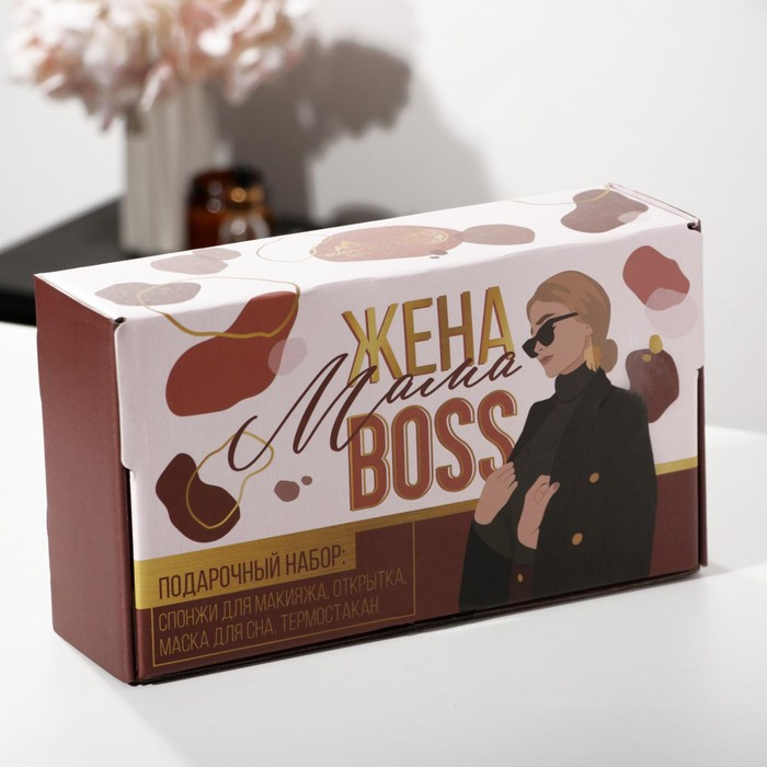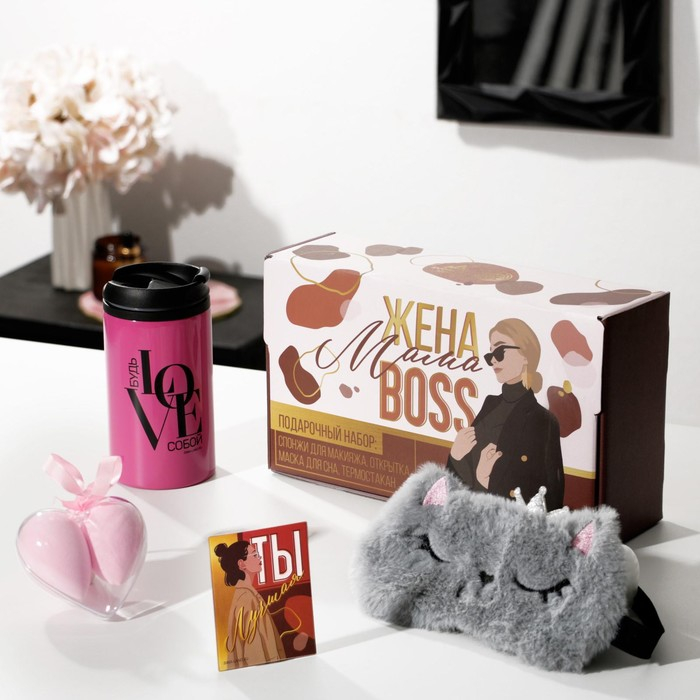 Подарочный набор «Жена, мама, босс», маска для сна, термостакан, спонж 2 шт, открытка