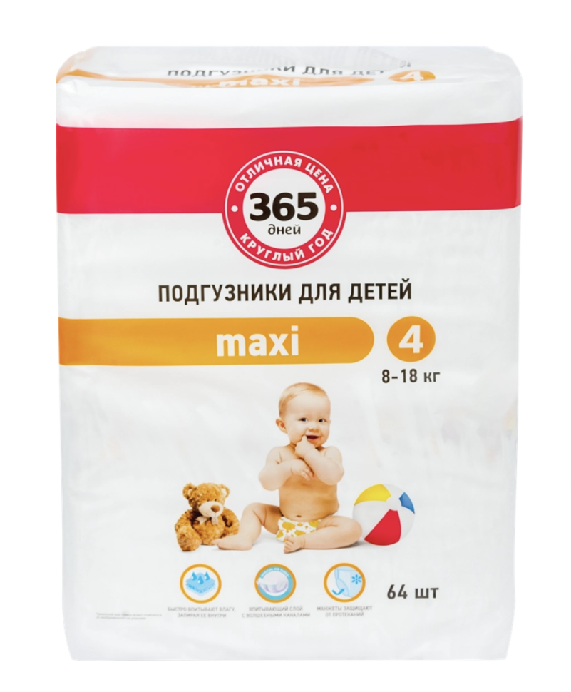 Подгузники детские 365 ДНЕЙ Maxi 8–18кг, 64шт