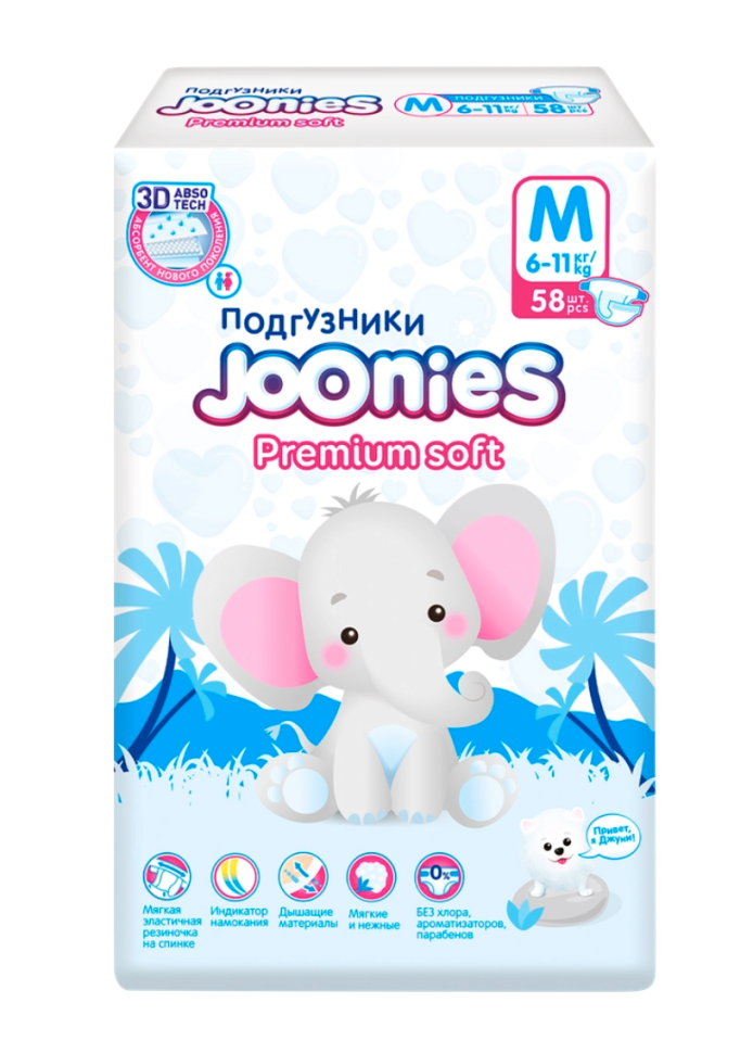 Подгузники детские JOONIES Premium Soft M 6–11кг, 58шт