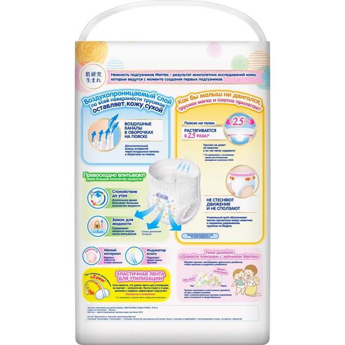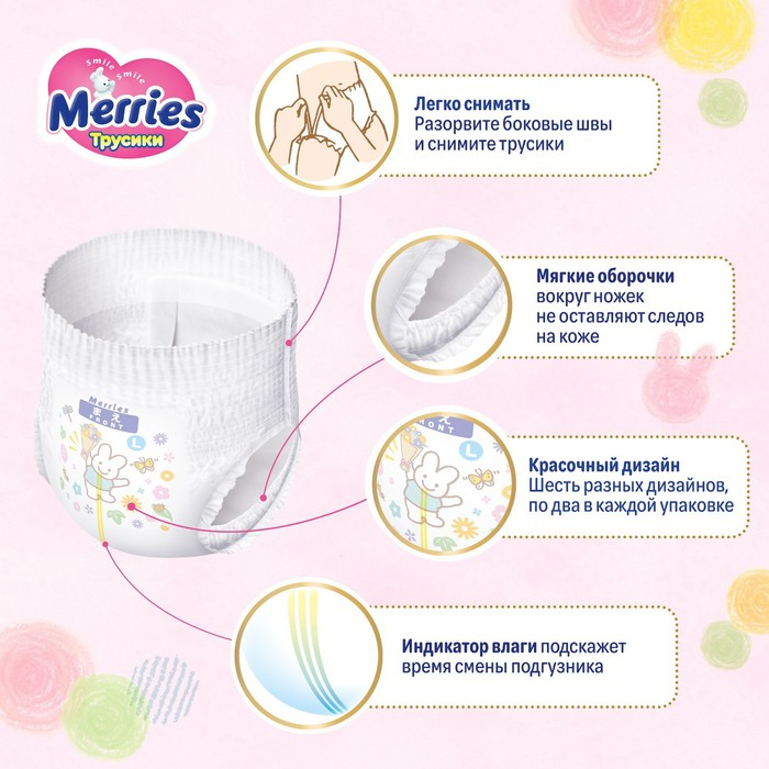 Подгузники-трусики Merries, размер L (9-14 кг), 44 шт.
