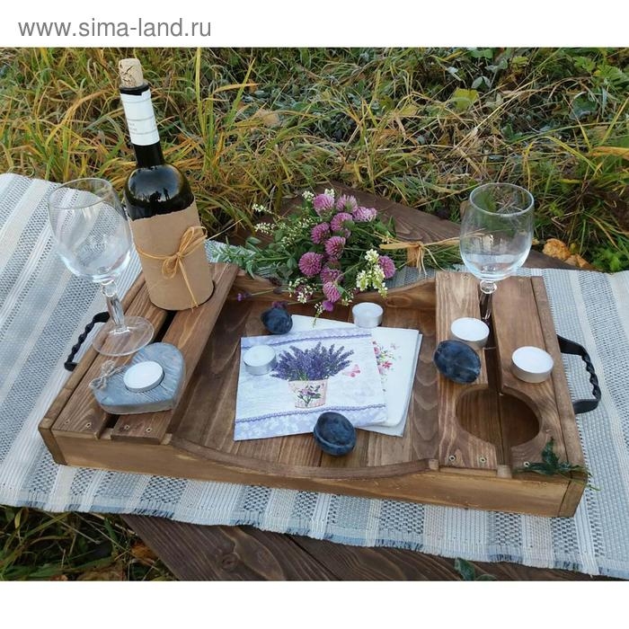 Поднос из дерева имеет 2 отверстия для удобного расположения бутылок вина и бокалов. Это гарантирует устойчивость и надёжную фиксацию. Помимо этого поднос имеет стильный вид.