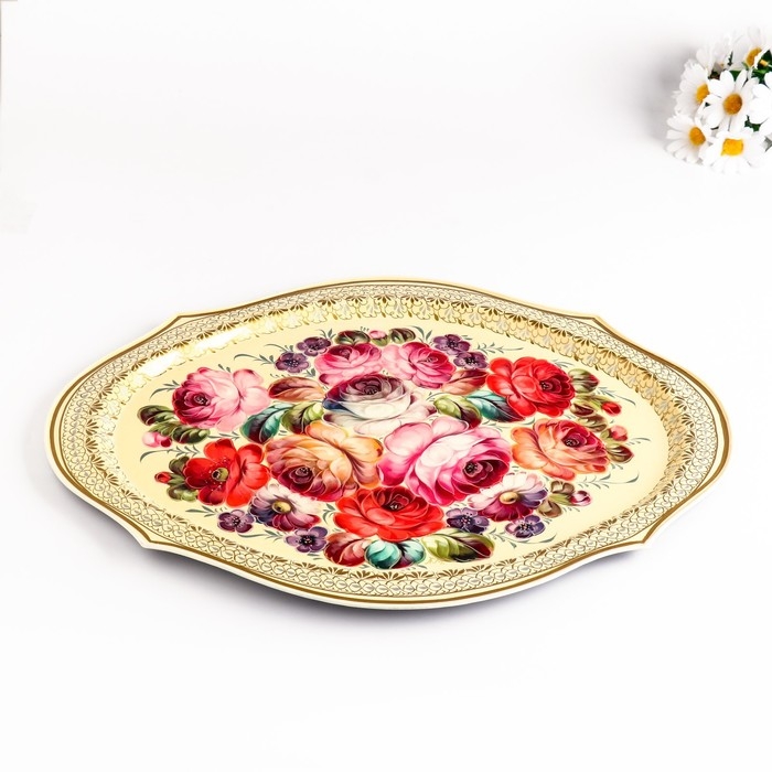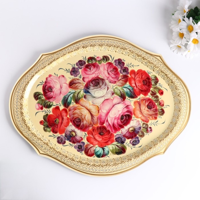 Поднос жостовский "Цветы", белый, с авторской росписью 47х37 см