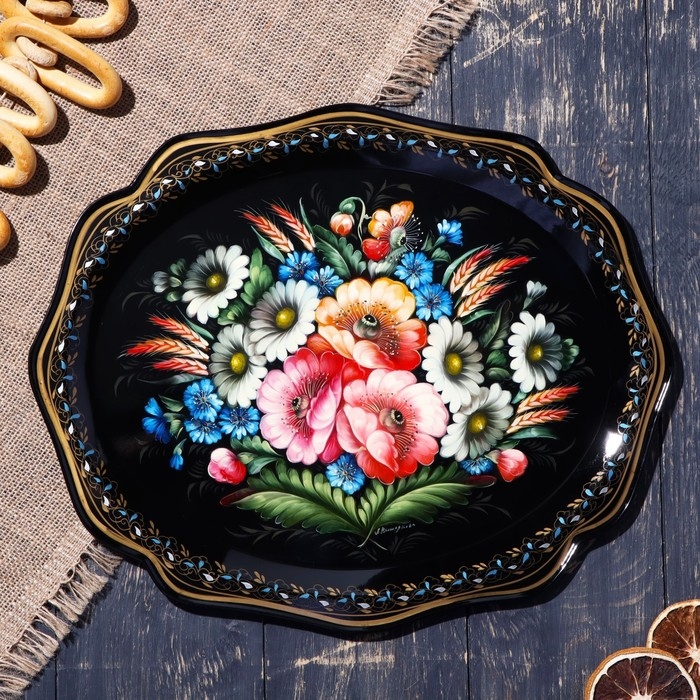 Поднос жостовский "Цветы", синий, с авторской росписью, 38х31 см