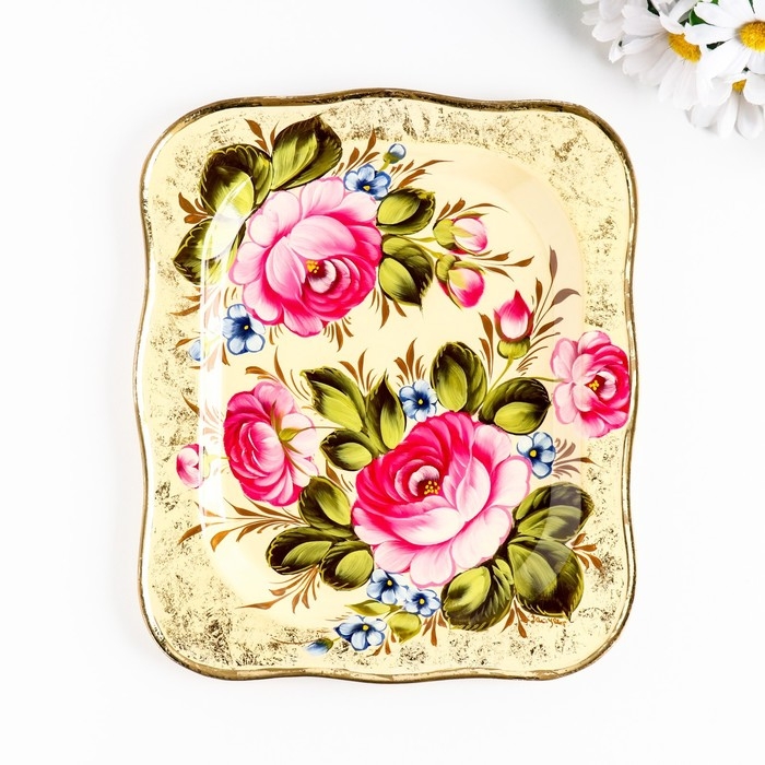 Поднос жостовский "Розовые цветы", белый, с авторской росписью, 30х23 см