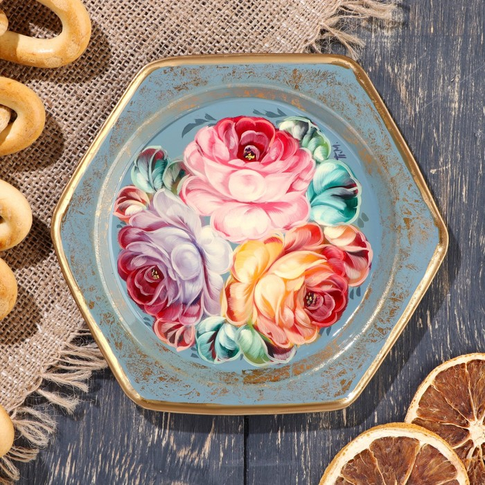 Поднос жостовский "Розы", угловой, D=15 см