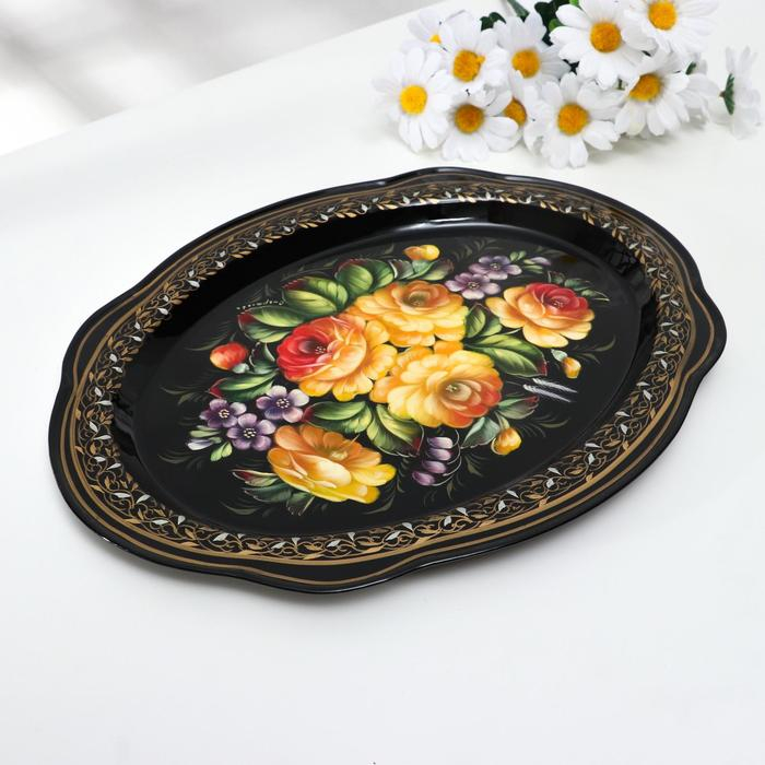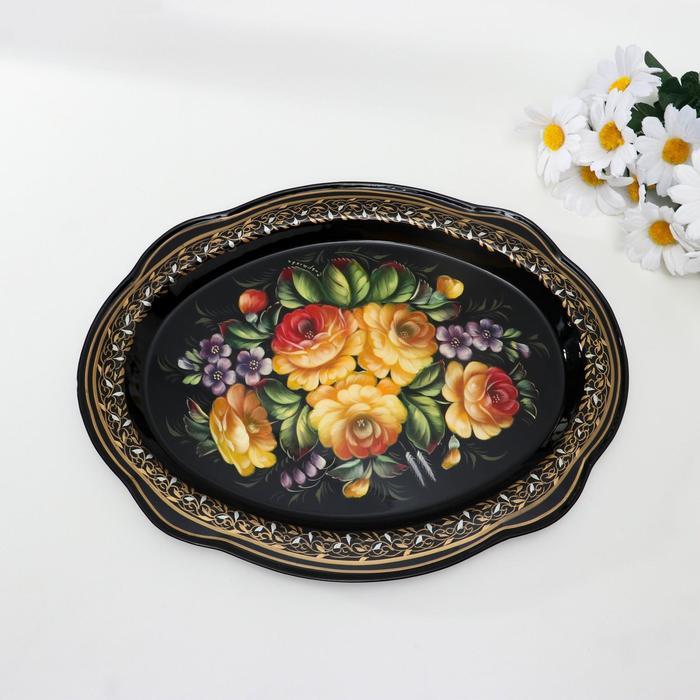Поднос жостовский "Жёлтые розы", кружевной, автор Владыкина, 30х23 см, малый, овал