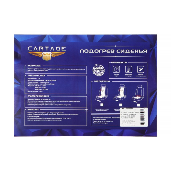 Подогрев сидений «Cartage» - это отличное решение для вашего автомобиля! Он имеет два режима нагрева: 30 и 50 Вт. Работает от бортовой сети 12 В. Размер подогрева составляет 40x80 см. Нагревательный элемент - нити MicroHEAT - обеспечивает равномерное и быстрое нагревание. Этот аксессуар идеально подходит для холодного времени года и обеспечивает комфорт и уют в вашем автомобиле.