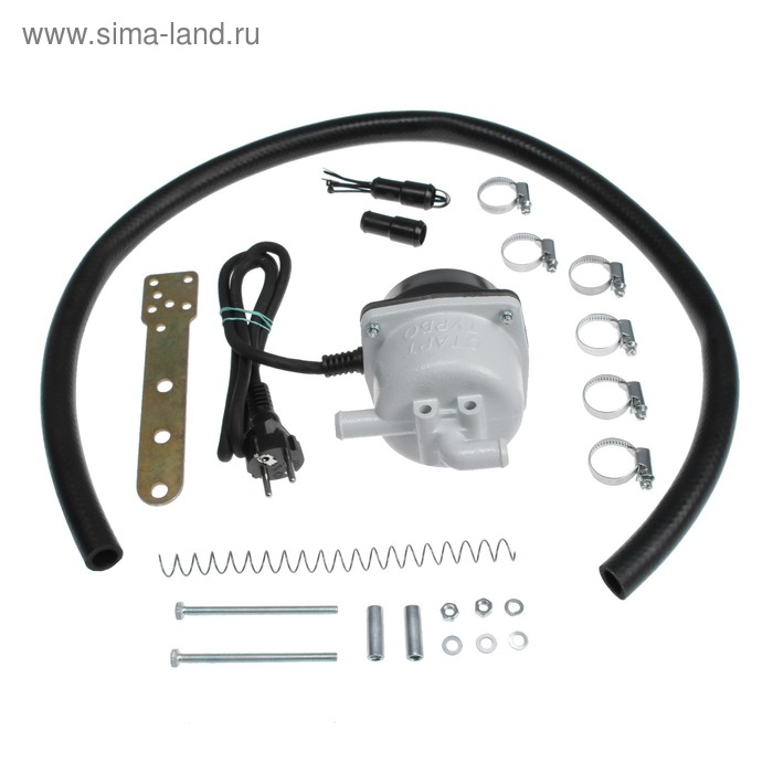 "Старт-Турбо" предназначен для предпускового разогрева и подогрева двигателей легковых, среднетоннажных и грузовых автомобилей отечественного и зарубежного производства в зимний период эксплуатации. При подключении подогревателя к сети переменного тока напряжением 220В электроподогреватель – ТЭН, находящийся внутри корпуса, начинает нагревать охлаждающую жидкость. Одновременно включается центробежный электронасос. Центробежный электронасос обеспечивает непрерывную циркуляцию охлаждающей жидкости через подогреватель и рубашку системы охлаждения двигателя, к которой подключен подогреватель. Этим достигается быстрый и равномерный прогрев двигателя, а также исключается перегрев ТЭНа и увеличивается срок его службы. Терморегулятор автоматически поддерживает температуру охлаждающей жидкости в заданных пределах и предотвращает её перегрев при длительной работе подогревателя. Время разогрева двигателя зависит от климатических условий (температура, ветер), а также от условий стоянки автомобиля (открытая стоянка, гараж). Комплект Монтажный Универсальный содержит необходимые комплектующие для установки в систему охлаждения ДВС последовательно с отопителем салона.
