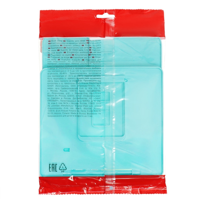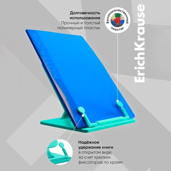 Складная подставка с фиксатором для книг. Рисунок нанесен тампопечатью. Позволяет расположить книгу под удобным углом наклона (7 углов). Держатель, расположенный в нижней части, надежно фиксирует страницы. Ширина подставки — 235мм, высота спинки — 190мм.