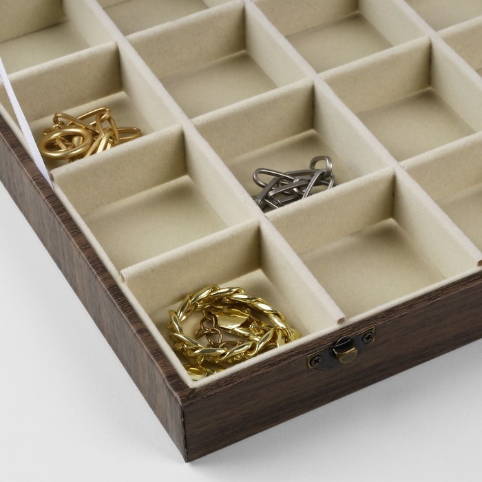 Если вы занимаетесь реализацией разнообразных украшений и аксессуаров, то вам нужно наглядно продемонстрировать свой товар, представив его в лучшем виде. Подставка для украшений «Шкатулка дерево» 24 ячейки, 35,2×24×5 см, цвет бежевый в дереве как нельзя лучше справится с этой задачей! У каждого украшения появится своё место, откуда его можно будет хорошо рассмотреть.