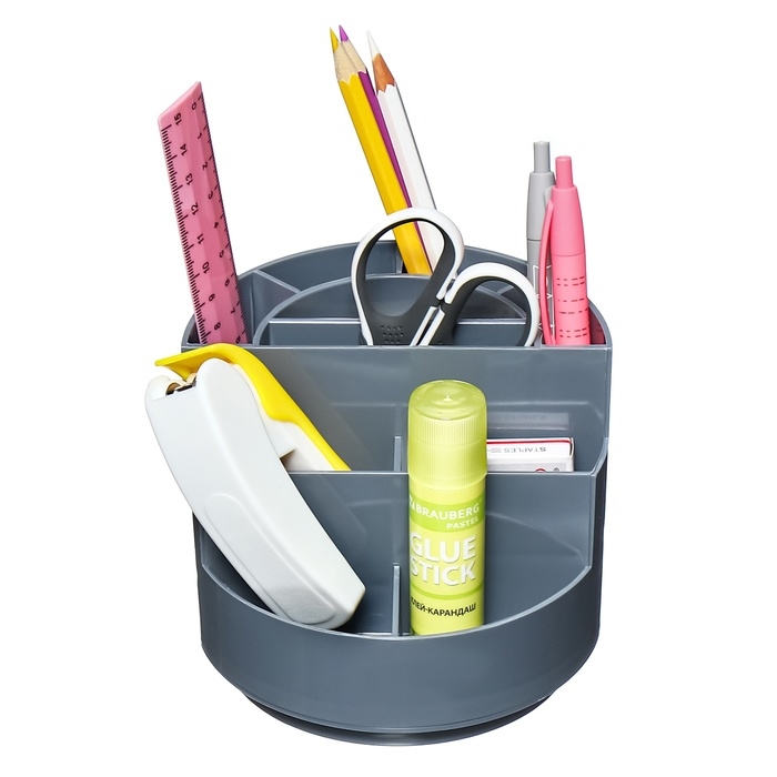 Подставка для удобного хранения настольных принадлежностей. Оснащена вращающимся механизмом и изготовлена из высококачественного пластика.