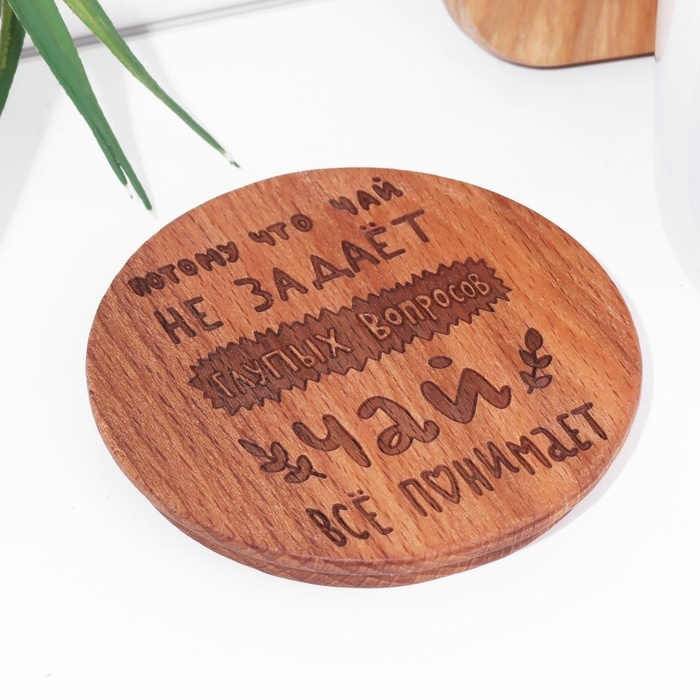 Подставка под горячее "Потому что чай не задает глупых вопросов", дерево