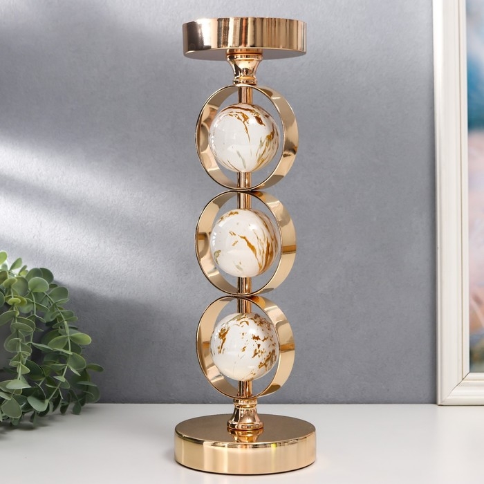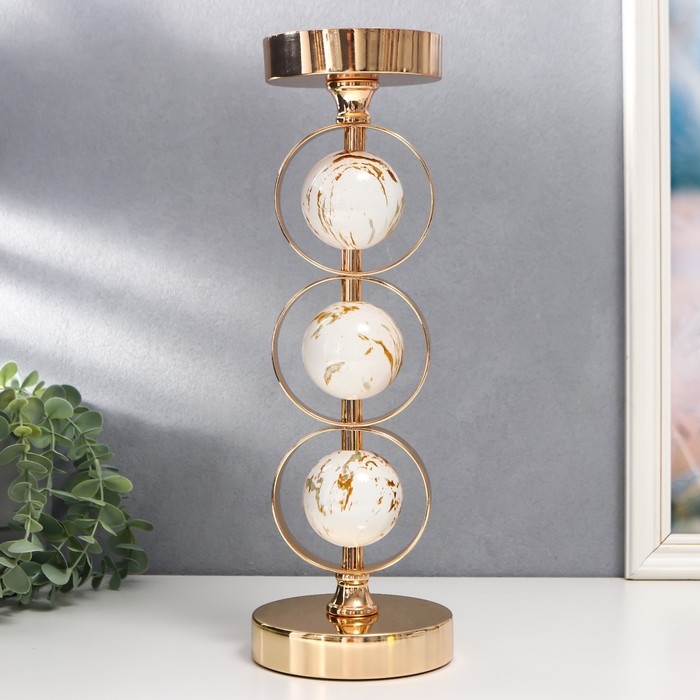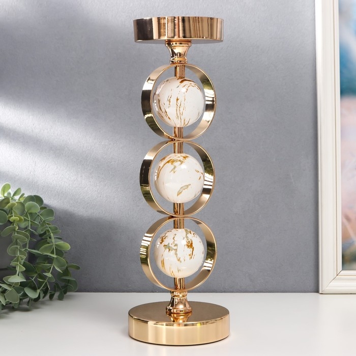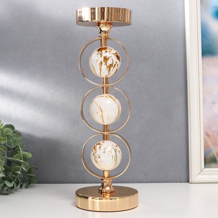 Подсвечник металл на 1 свечу "Три белых мраморных шара в сферах" золото 37х12х12 см