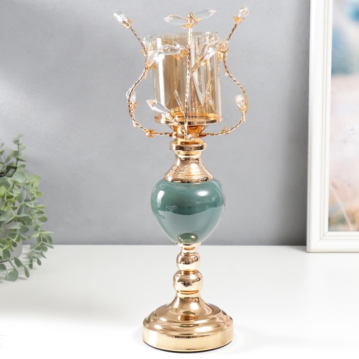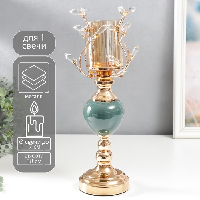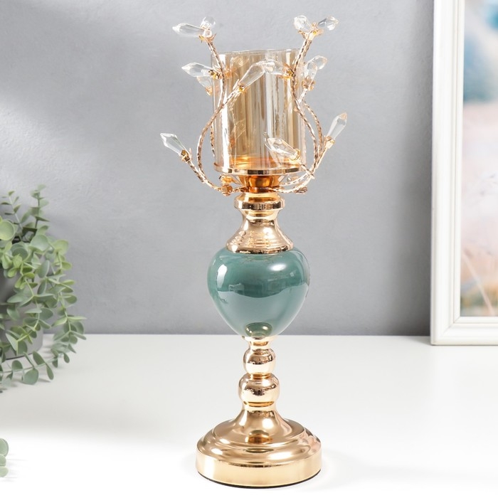 Подсвечник металл на 1 свечу "Веточки с кристаллами. Сине-зелёный шар" золото 38х17х17 см