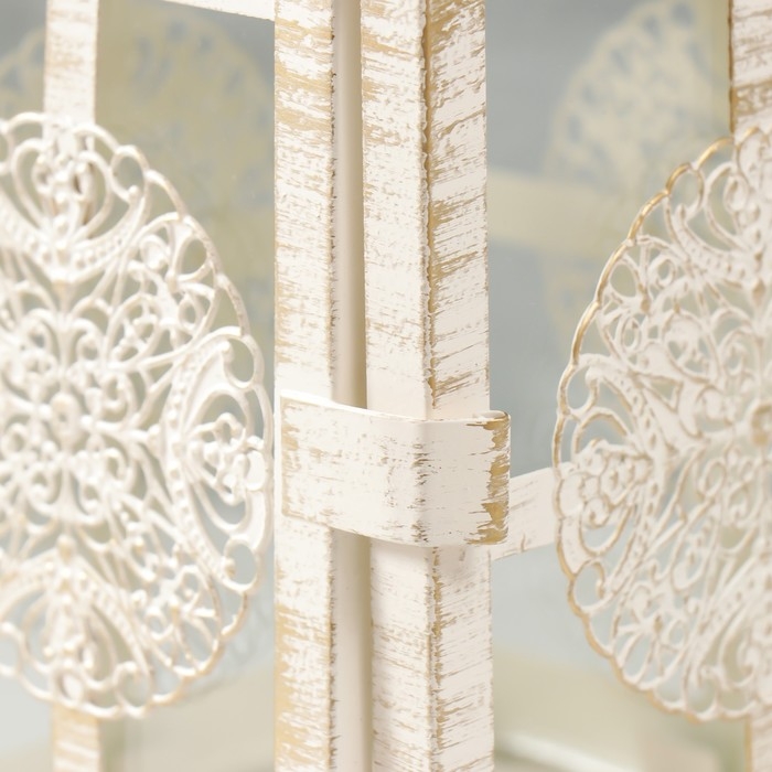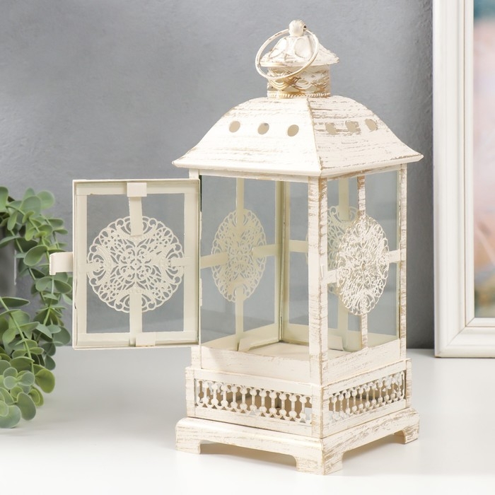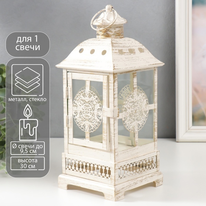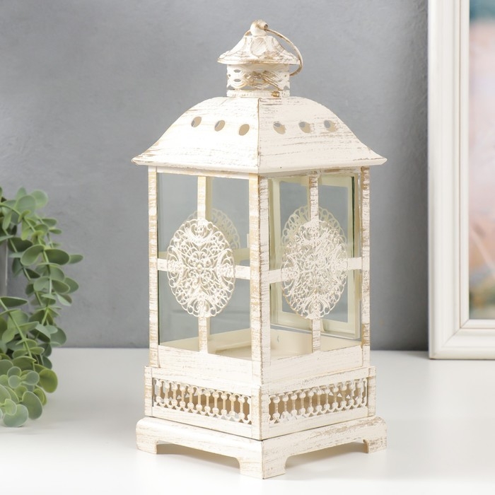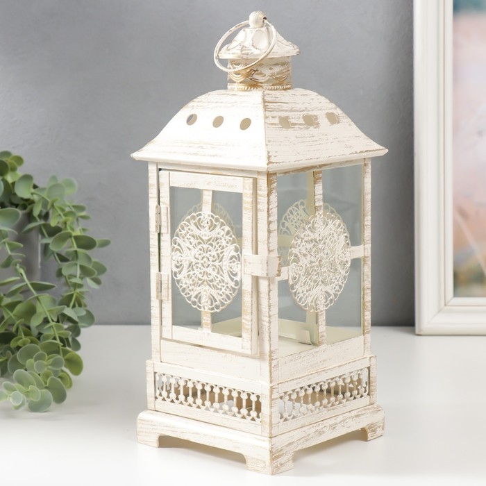 Подсвечник металл, стекло "Фонарь - круглый цветок" белый с патиной 12,5х12,5х30см