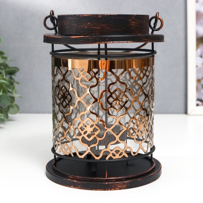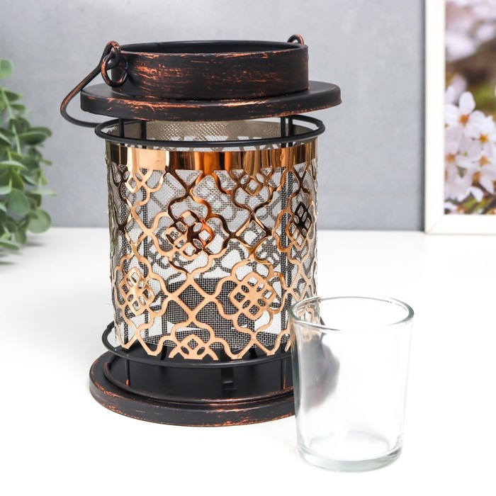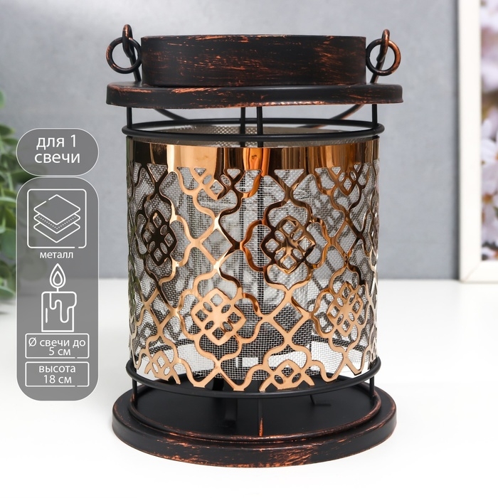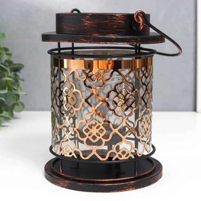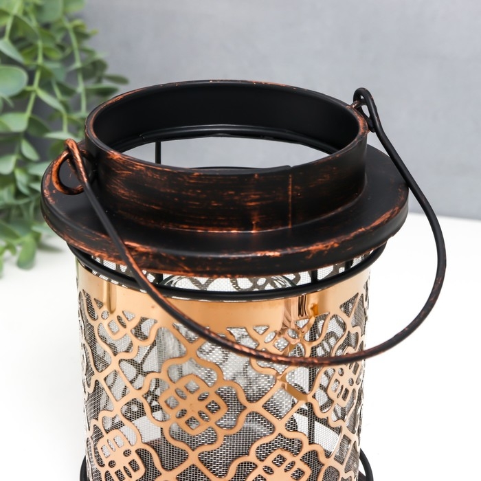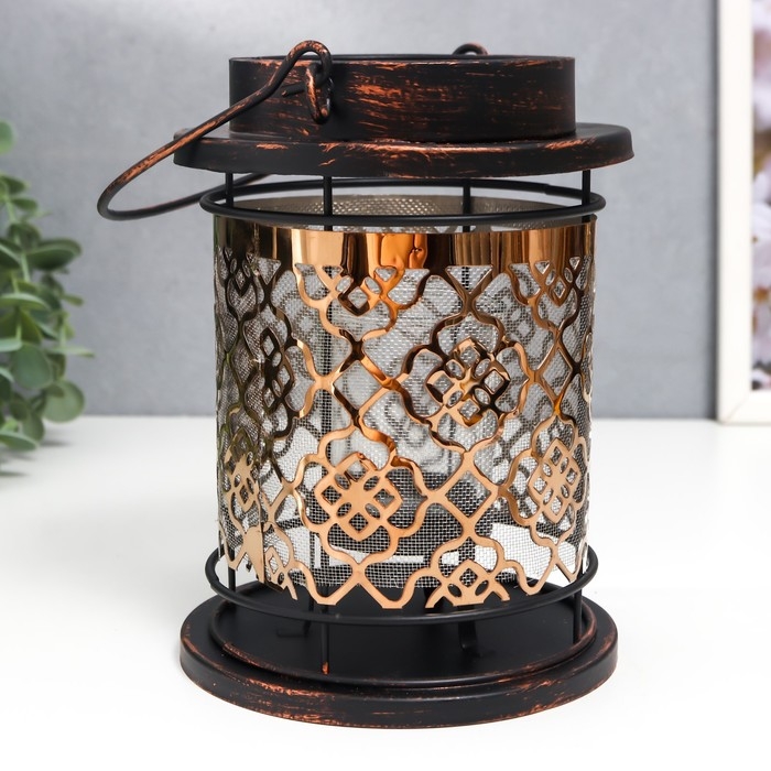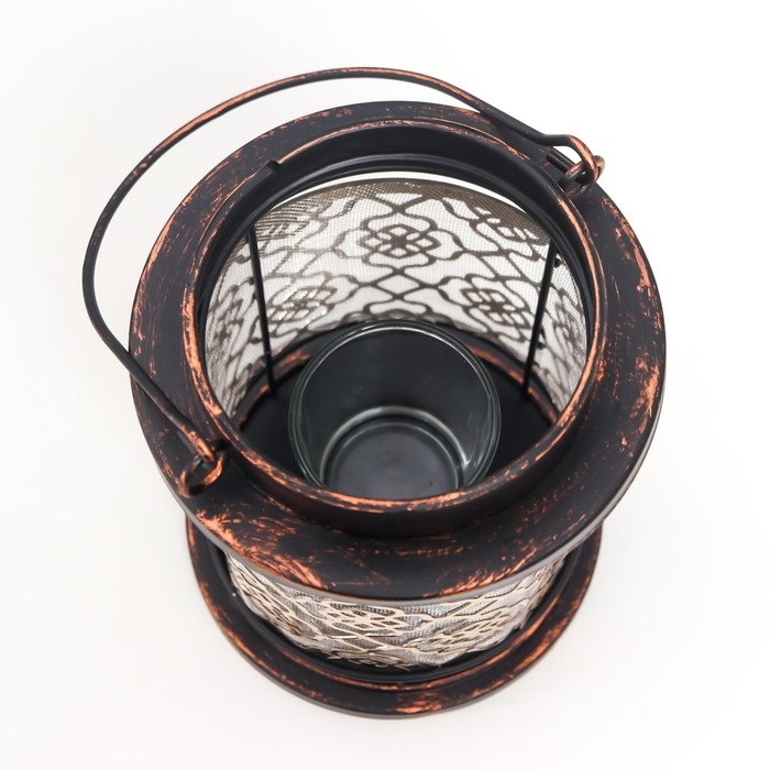 Подсвечник металл, стекло на 1 свечу "Узор на фонаре" патина на чёрном ручка 18х13,5х13,5 см 78228