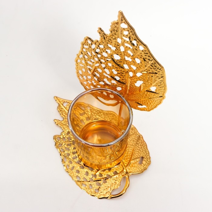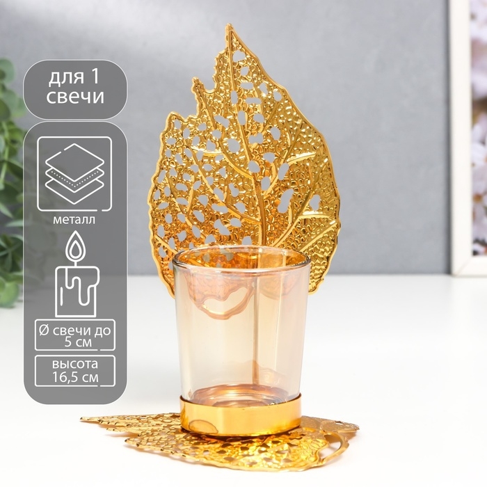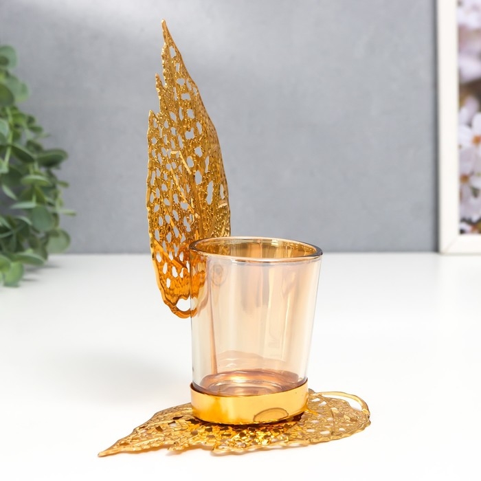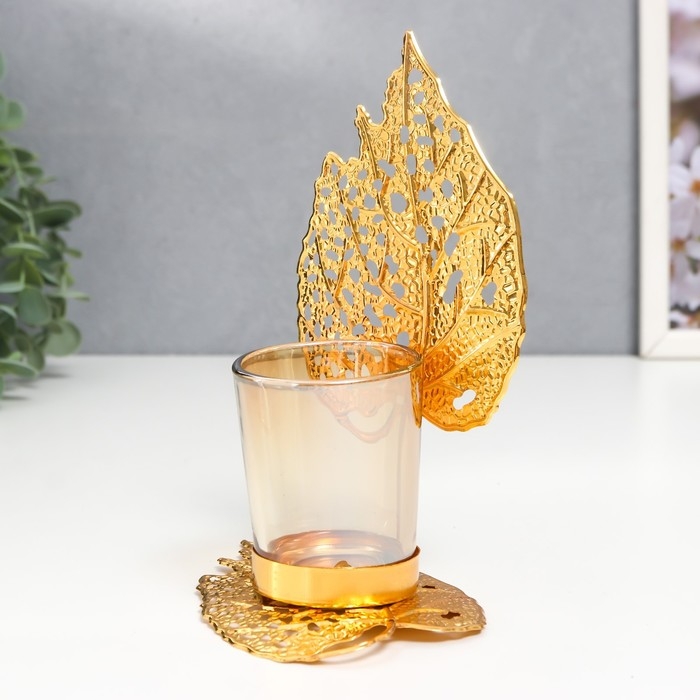 Подсвечник металл, стекло на 1 свечу "Золотые листики" d-5 см 8х12х16,5 см