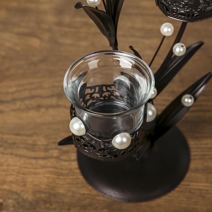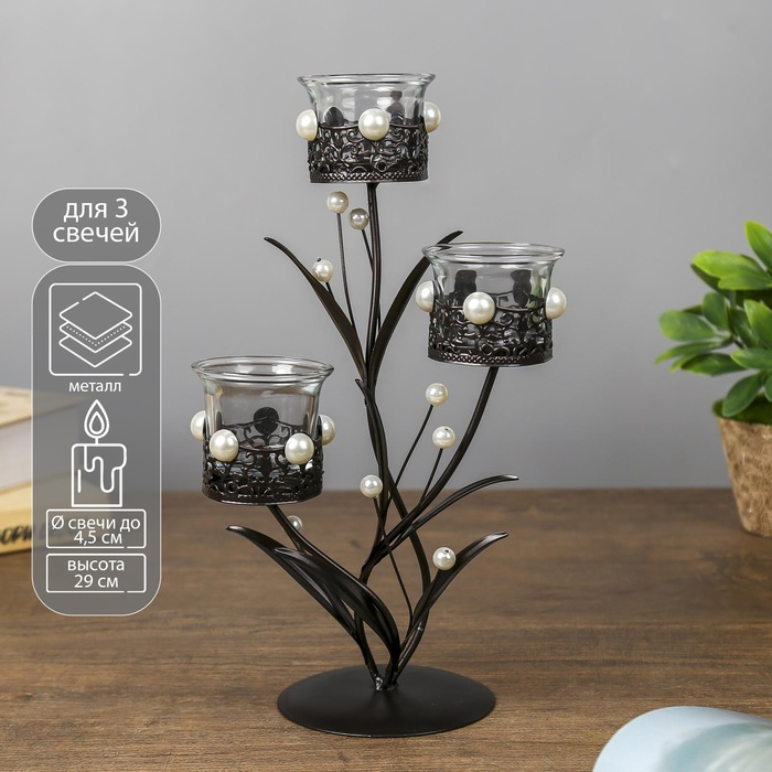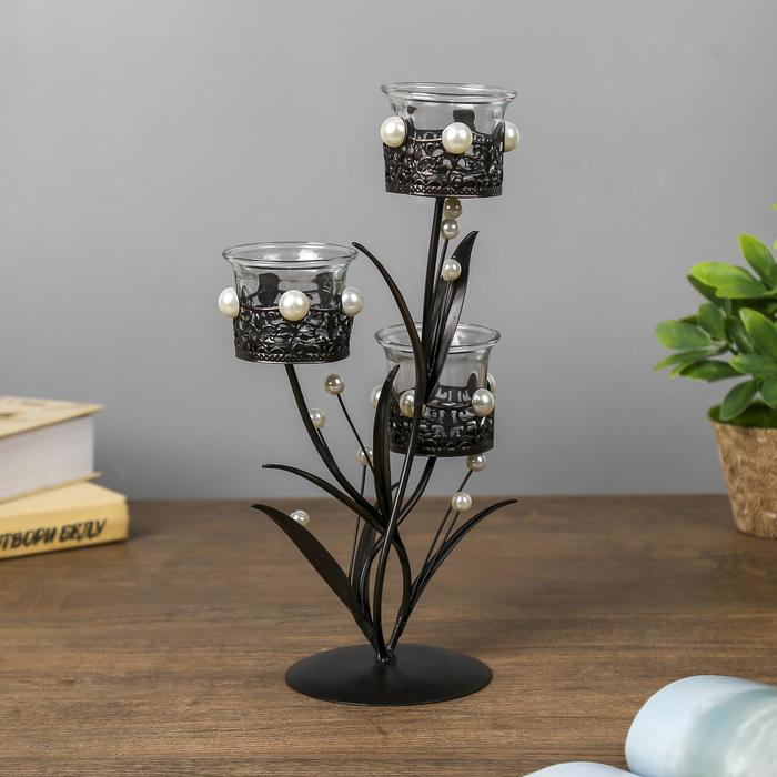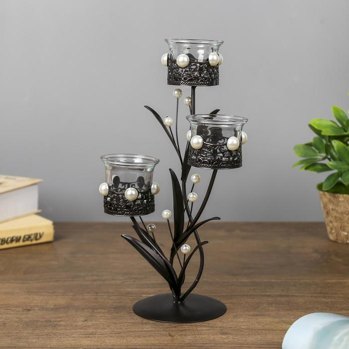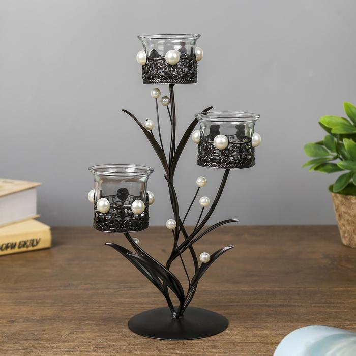 Подсвечник металл, стекло на 3 свечи "Ажурный с жемчугом" чёрный 29х15х11,5 см