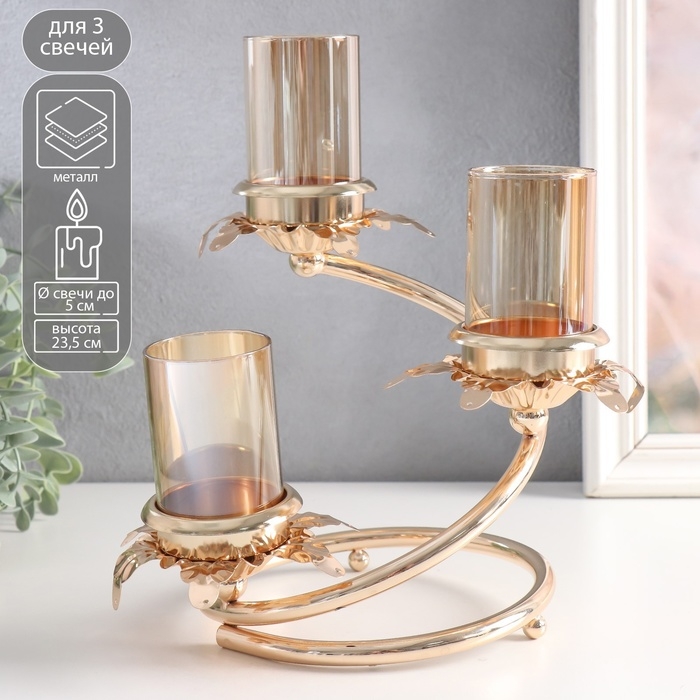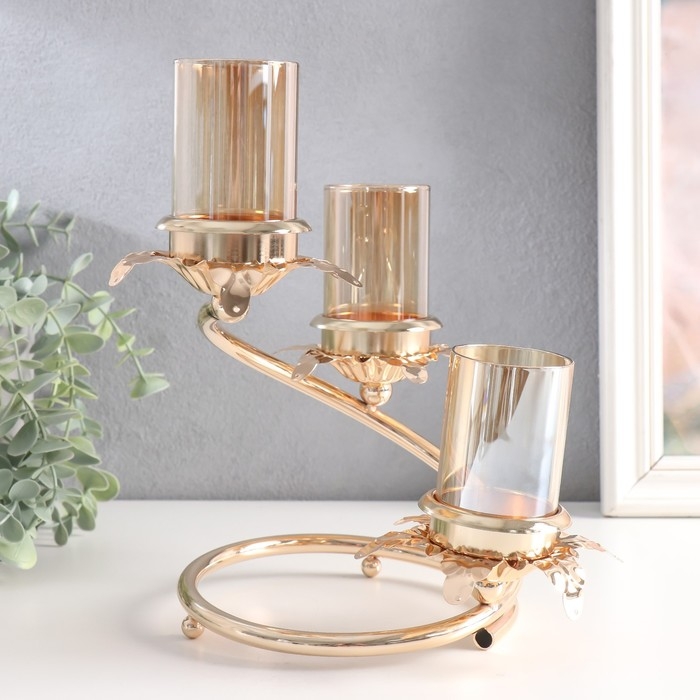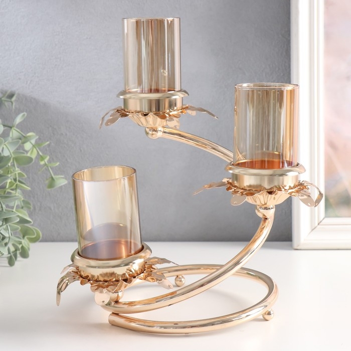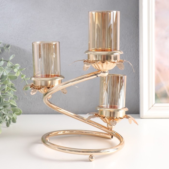 Подсвечник металл, стекло на 3 свечи "Ветвь с листиками" d-5 см золото 15х15х23,5 см